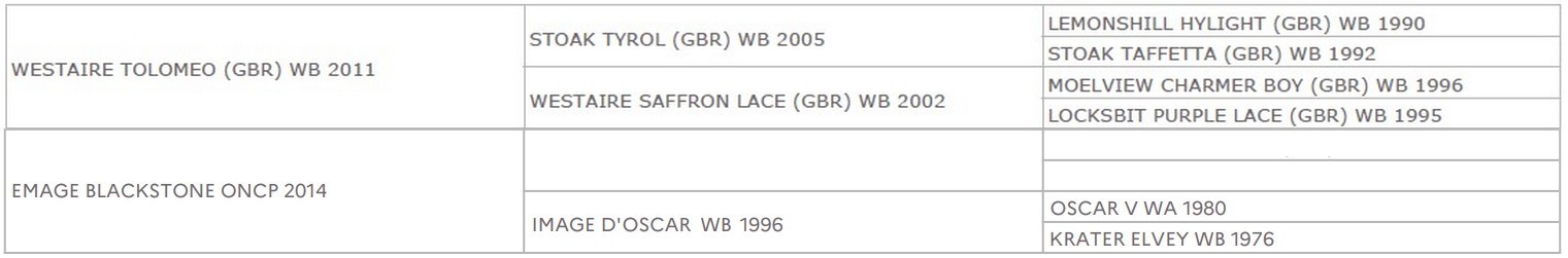 * Petit clin d’oeil à l’élevage KIRBY CANE, et en particulier à l’étalon KIRBY CANE STATECRAFT, qui avait produit en 1985 avec KRATER ELVEY (la grand-mère d’EMAGE) le tout bon TEDDY BLACKSTONE…